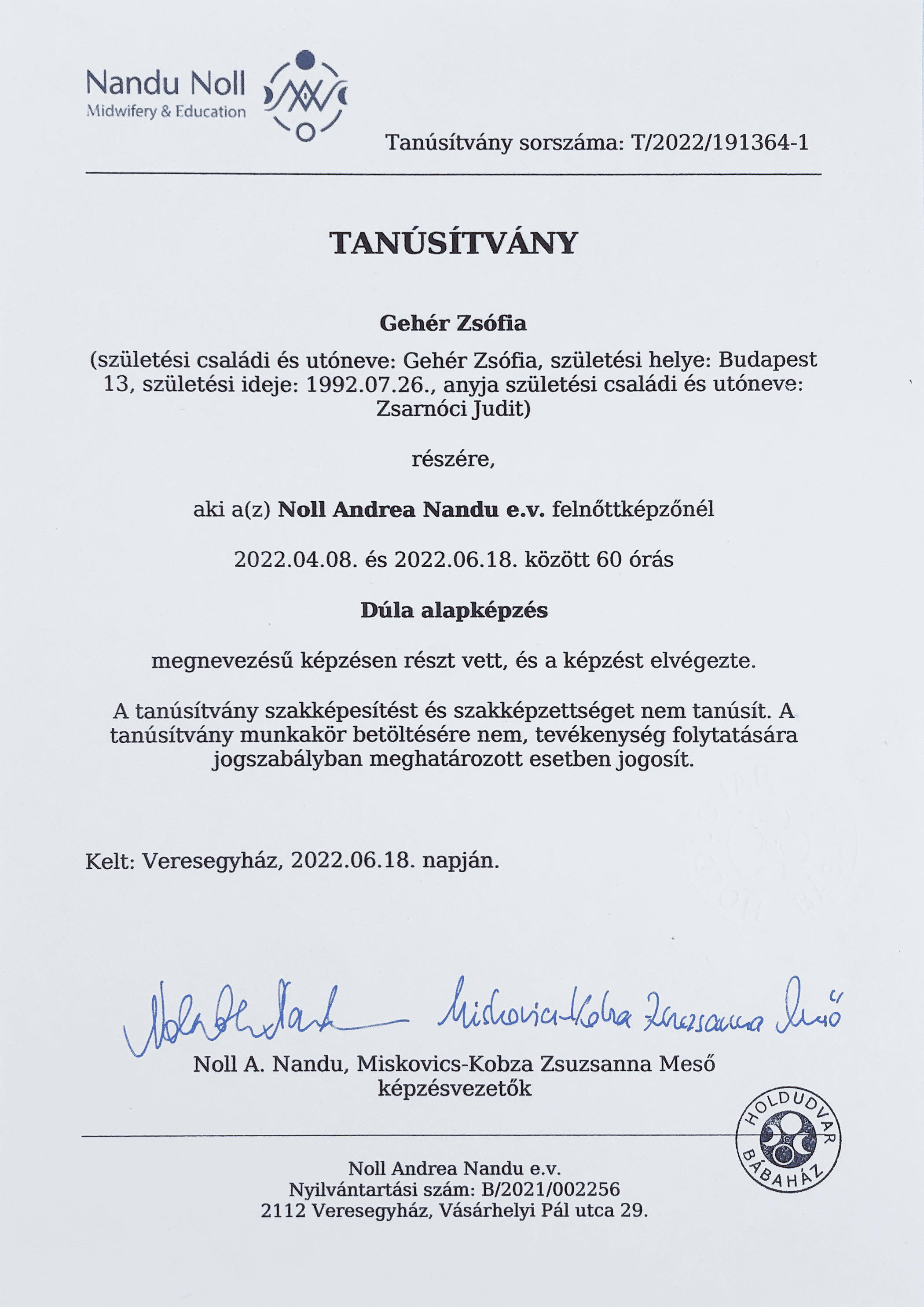 Basic Doula training - 60 hours - Noll A. Nandu (2022. Veresegyház)