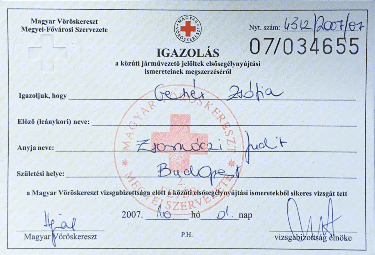 First Aid Training - 10 hours - Magyar Vöröskereszt Megyei-Fővárosi Szervezte (2007. Budapest)