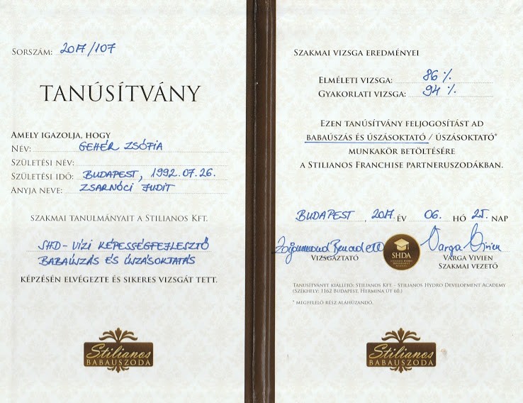 SHD Aquatic Development for Baby Swimming and Swim Instructor Training - 250 hours - Stilianos Kft. (2017. Budapest)