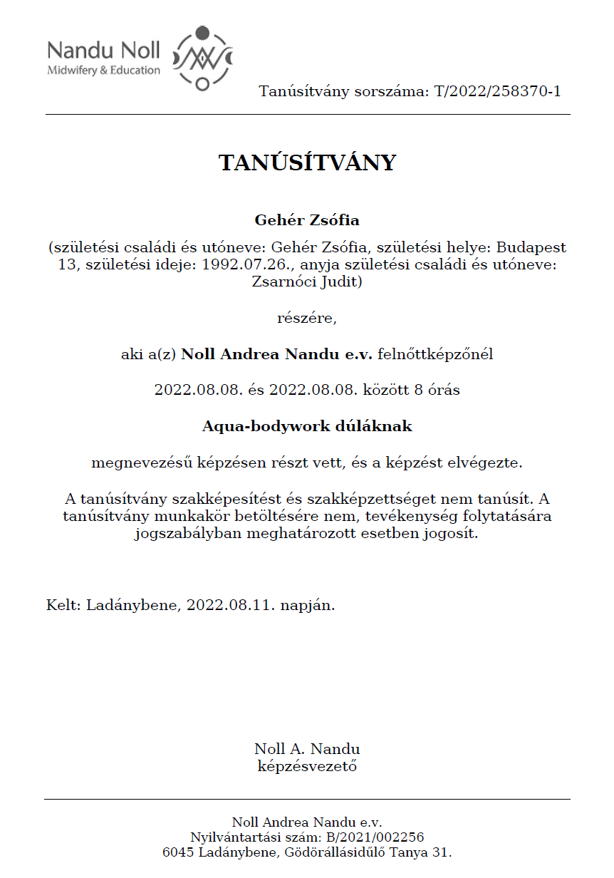 Aqua-bodywork for Doulas - 8 hours - Noll A. Nandu (2022. Ladánybene)