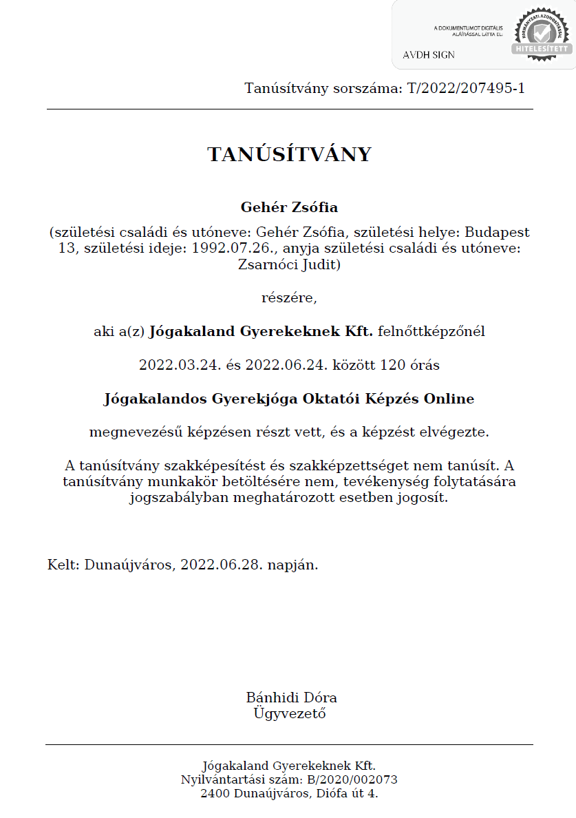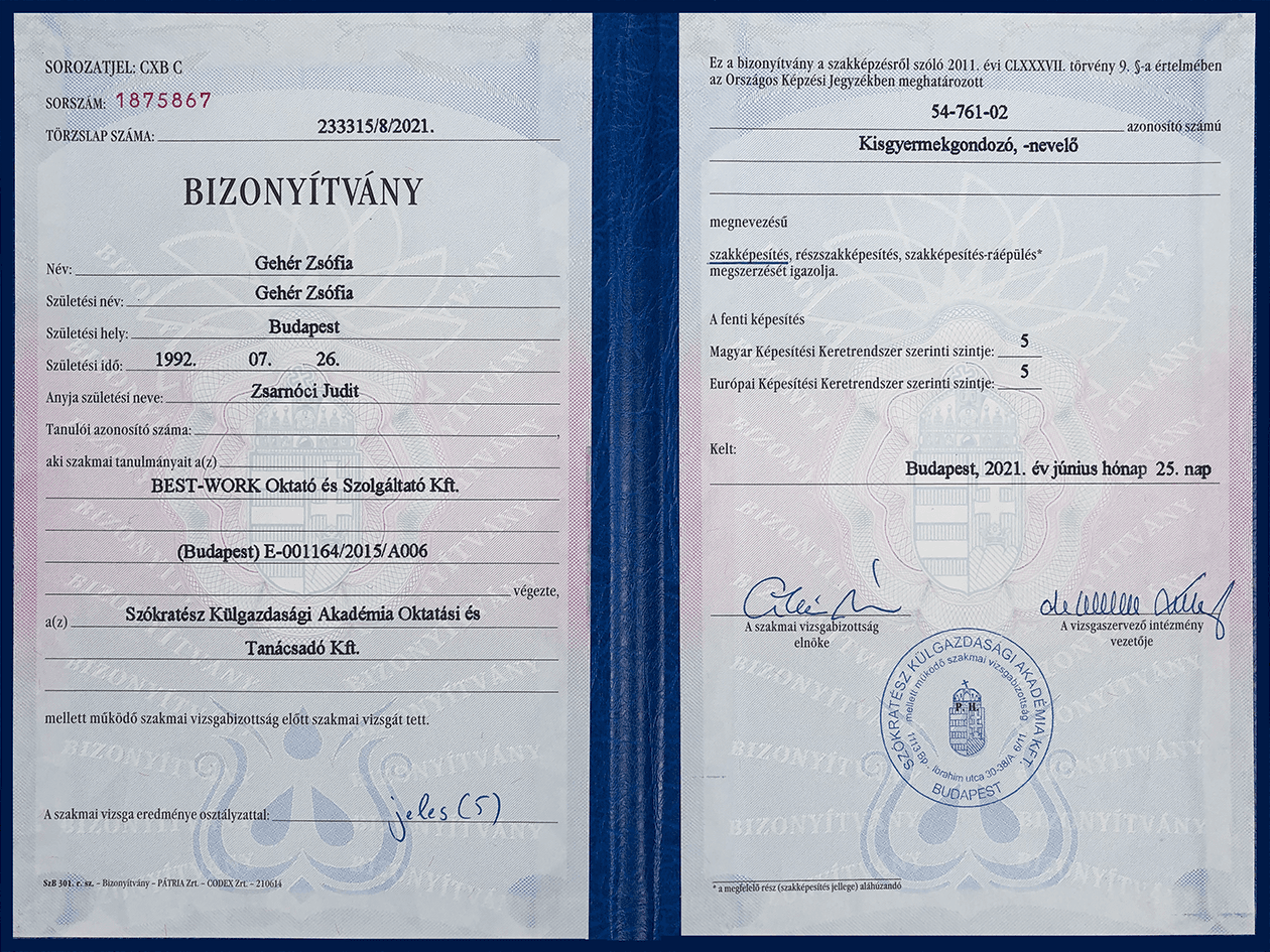 2020-2021: Best-Work Oktató és Szolgáltató Kft. : Nursery Caregiver, Childcare Specialist (OKJ 54 761 02)